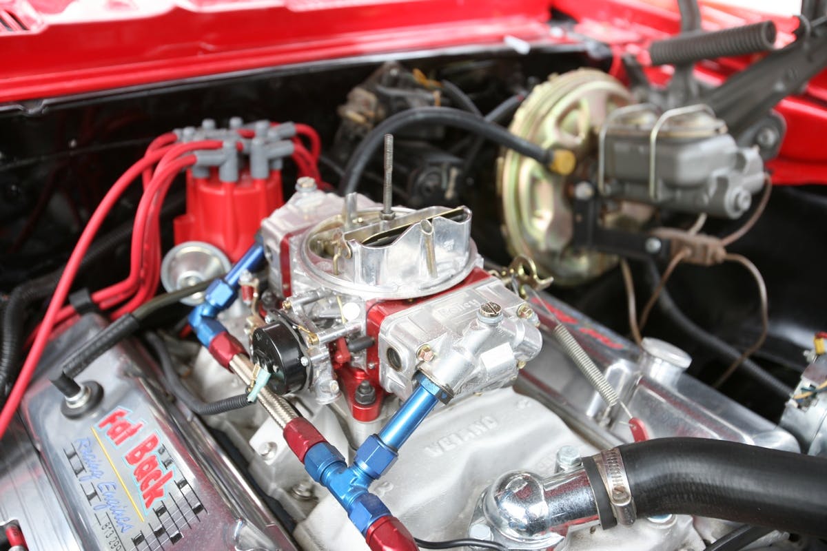 During those 18 months, Judd and one of his coworkers, Alex Ortiz stripped the sheetmetal of all paint, fixed what little rust was found, and then straightened each panel before another coworker, Thi Trong Do, was able to cover the car with an eye-searing Torch Red hue. To upgrade the car’s appearance, Judd chose to include a 2-inch cowl-induction hood and rear spoiler in the rebuild, even though this car did not come so equipped.