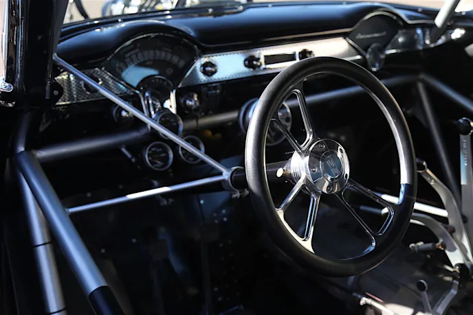 Striving to maintain the Chevy’s originality, Darren and his friends did as much as they could to retain the car’s factory qualities. Hand-building the entire frame, the caging was able to house the original dash. “We also modified the base of the stock mirror to fit the chassis bar, but it is still the original ’55 Chevy mirror at the end of the day,” Darren said.