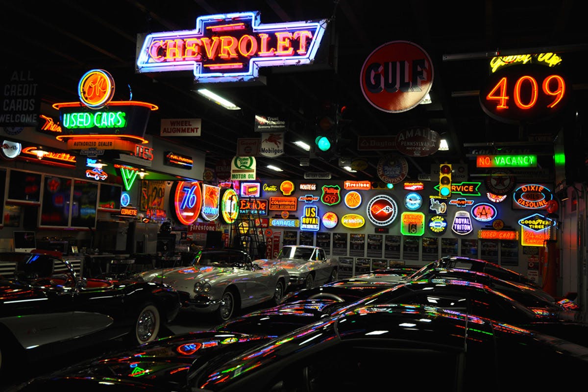 Michael's garage is not just full of Chevys, but also various neon signage that gives a throwback feel to the collection. Photos courtesy of Pepper Yandell.