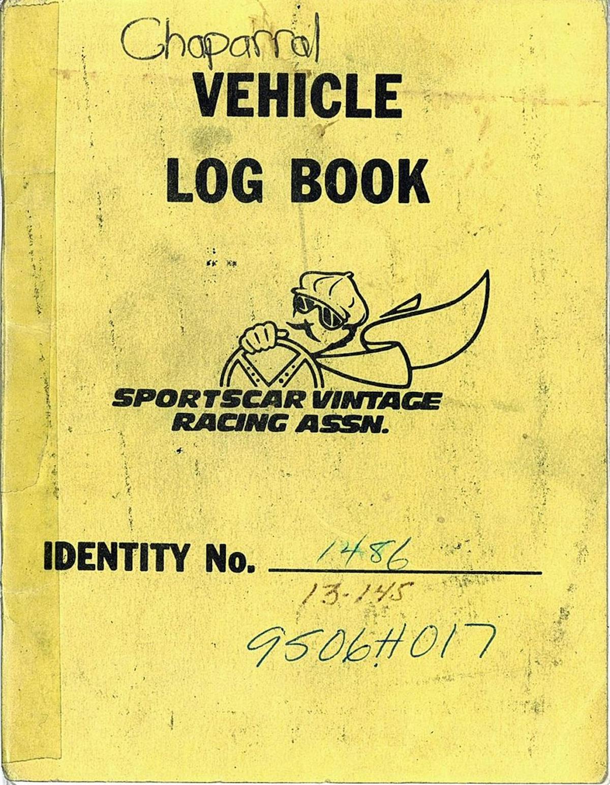 Documentation accompanying the No. 1 Chaparral Camaro is its SVRA log book, detailing where and when it’s seen vintage-racing action.