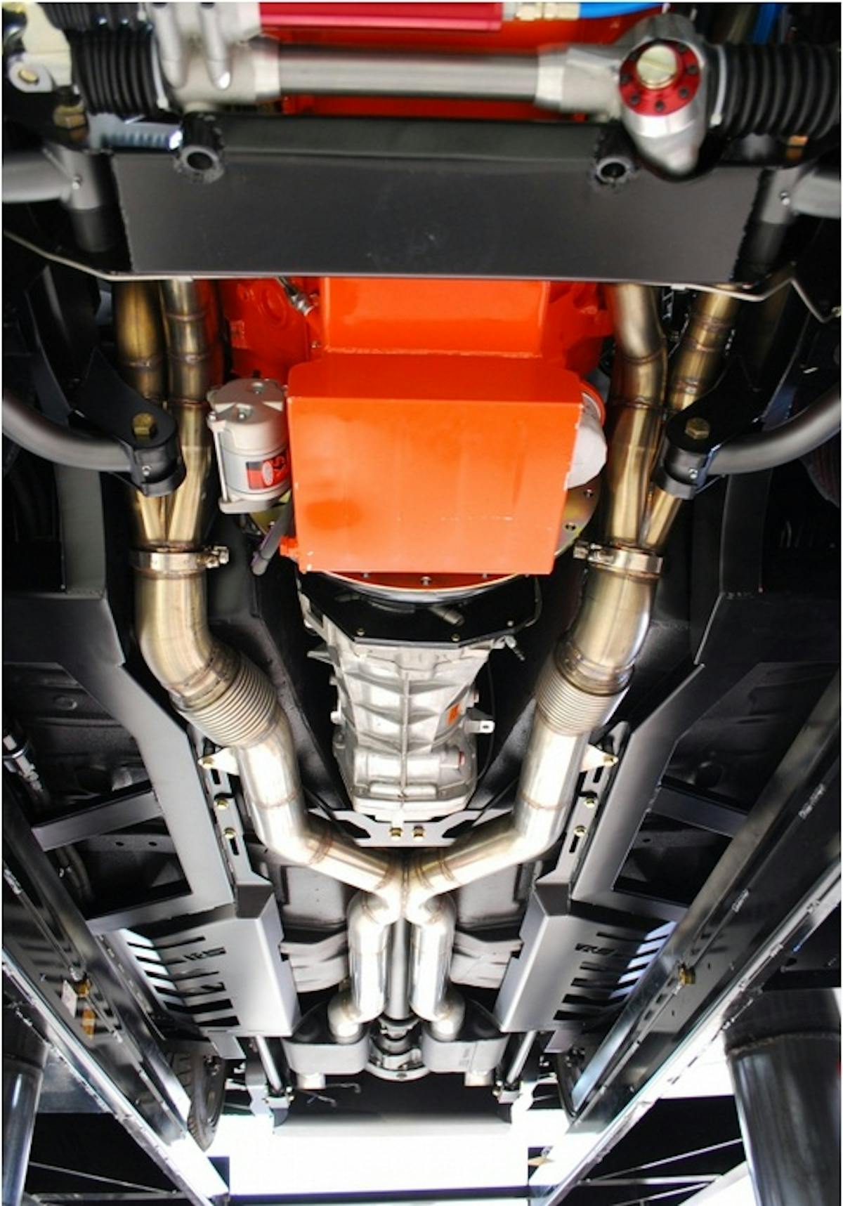 This fully custom setup by the Roadster Shop features a C6 Corvette spindle and Z06 hub assembly, a 1.25-inch splined front sway bar with C6 Corvette end links, a custom center crossmember with an adjustable, drop-out transmission mount, a mid brace crossmember with exhaust ports, and custom fully boxed, 10-gauge frame rails.