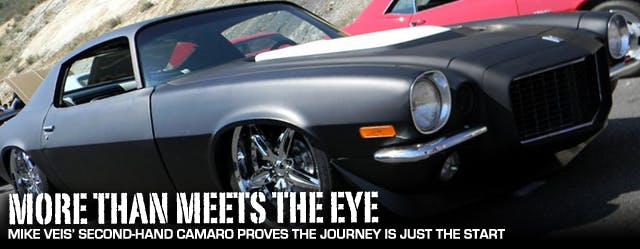 Other things done to the Camaro include equipping it with an L88 Corvette hood with independent shaker setup and dropping in a 350ci. small-block engine underneath, stroked out to 391 cubic inches with an 11:1 compression ratio and equipped with Headman Headers that dump into 3-inch Cherry Bombs and exit under the front seat. The engine is matted to a 700R4 transmission and when asked about his automatic transmission choice, Veis told us, “I want to drive the car and enjoy it and not have to work. I want to drive it anywhere and anyway I want to.”