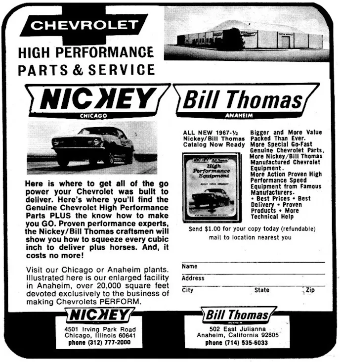 Road course, oval track, drag strip—if there was any place where cars raced in and around Chicago back then, the Chevys that won likely had Nickey parts and know-how behind them. “Nickey hired Dick as a performance manager/racer,” says Stefano. “It was really Dick who was the impetus to try and build complete cars so we could homologate them for drag racing. While he was working for Nickey Chevrolet, he wrote letters to both NHRA and AHRA saying, ‘We’ve got these 427 Camaros that we’re building, we’re going to build X amount of them, they’re available to the public, and we’d like to get them legalized for [your] respective drag racing classes.’”