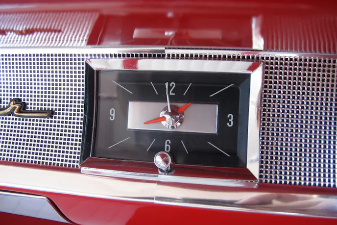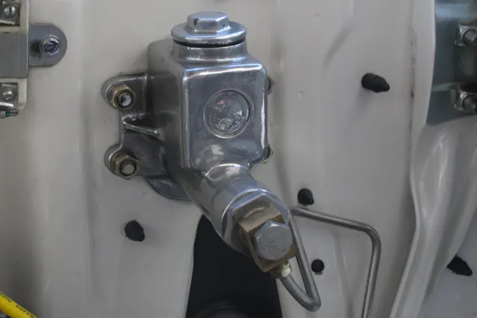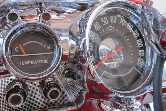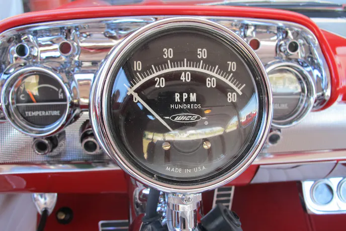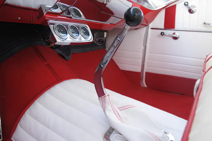 During the build process, Joe says he did take a few liberties and deviated from his initial dream car when bringing the project to fruition. “The original car was painted a pink pearl underneath, had a pink firewall, and pink carpet,” he says. “I just couldn’t do pink, so I used white pearl, red carpet, and some extra chrome-plated parts on the dash that Bill’s car did not have. The original car used a chrome-plated Turbo 400. I prefer to shift gears, so I installed an M20 originally tagged for a 1967 Corvette. The transmission is topped by a rare NOS Mr. Gasket bang shifter.”