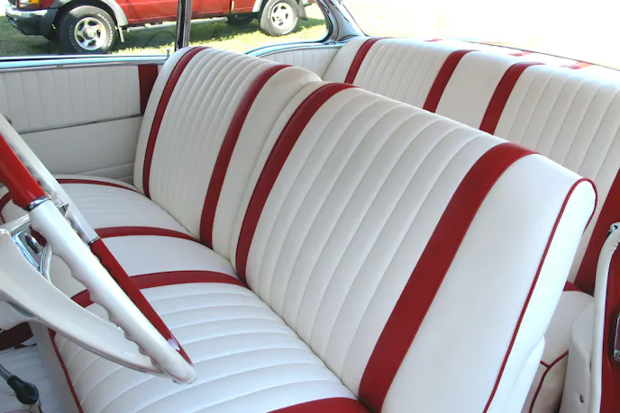 If you’re like many enthusiasts, red is a hot-button color. Joe chose to use Glasurit base/clear and had it applied by Melvin Bush of Lockhart Auto Body. The interior is a vintage statement that is timeless, and the stock front and rear seats are covered with red and white leatherette that is custom cloned from photos of the original by Ciadella Interiors.