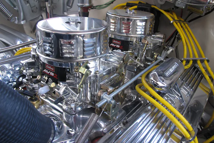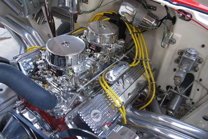 Under the machine-gun-adorned hood is a true testament to vintage hot rodding, a 1957 283ci V8 bored to 292 inches and rebuilt by the late Bo Laws. The camshaft is a COMP Cams Big Mother Thumper hydraulic flat-tappet with high compression pistons and 300 horsepower 327 heads benefitting from roller-tipped rockers. Carbs are twin Endura-Sine Edelbrock AVS2’s on a vintage Offenhauser intake. Headers are ceramic coated tubes by Patriot Exhaust.