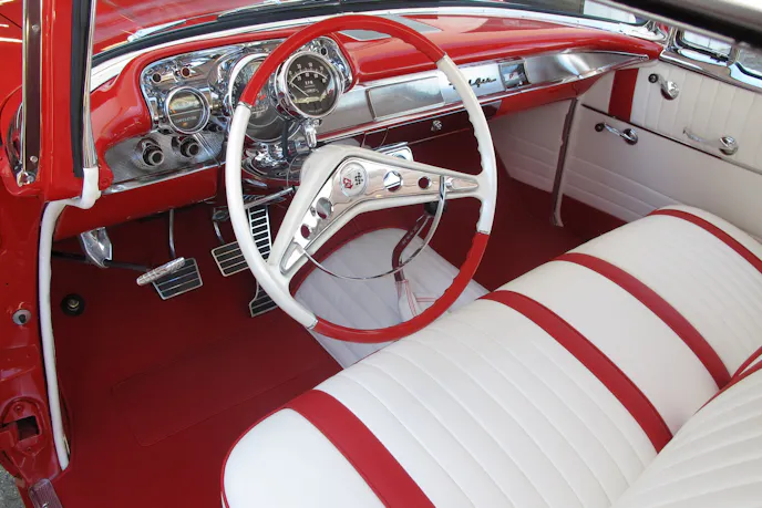 If you’re like many enthusiasts, red is a hot-button color. Joe chose to use Glasurit base/clear and had it applied by Melvin Bush of Lockhart Auto Body. The interior is a vintage statement that is timeless, and the stock front and rear seats are covered with red and white leatherette that is custom cloned from photos of the original by Ciadella Interiors.