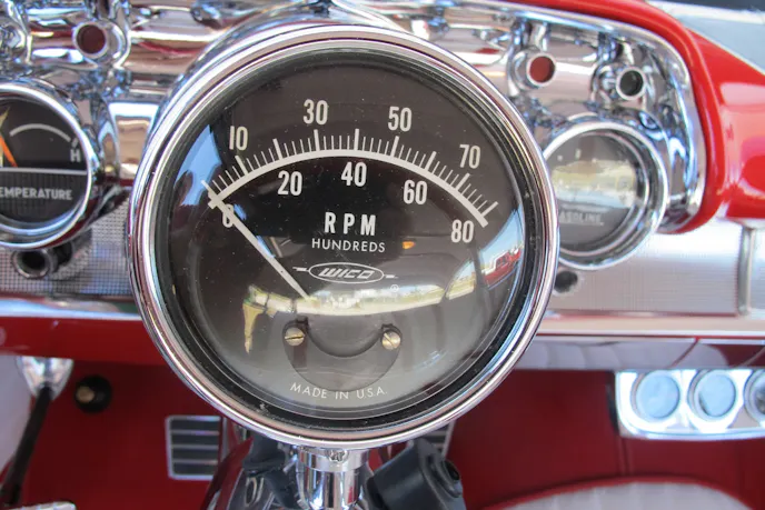 Under the machine-gun-adorned hood is a true testament to vintage hot rodding, a 1957 283ci V8 bored to 292 inches and rebuilt by the late Bo Laws. The camshaft is a COMP Cams Big Mother Thumper hydraulic flat-tappet with high compression pistons and 300 horsepower 327 heads benefitting from roller-tipped rockers. Carbs are twin Endura-Sine Edelbrock AVS2’s on a vintage Offenhauser intake. Headers are ceramic coated tubes by Patriot Exhaust.