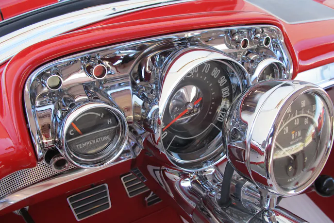 During the build process, Joe says he did take a few liberties and deviated from his initial dream car when bringing the project to fruition. “The original car was painted a pink pearl underneath, had a pink firewall, and pink carpet,” he says. “I just couldn’t do pink, so I used white pearl, red carpet, and some extra chrome-plated parts on the dash that Bill’s car did not have. The original car used a chrome-plated Turbo 400. I prefer to shift gears, so I installed an M20 originally tagged for a 1967 Corvette. The transmission is topped by a rare NOS Mr. Gasket bang shifter.”