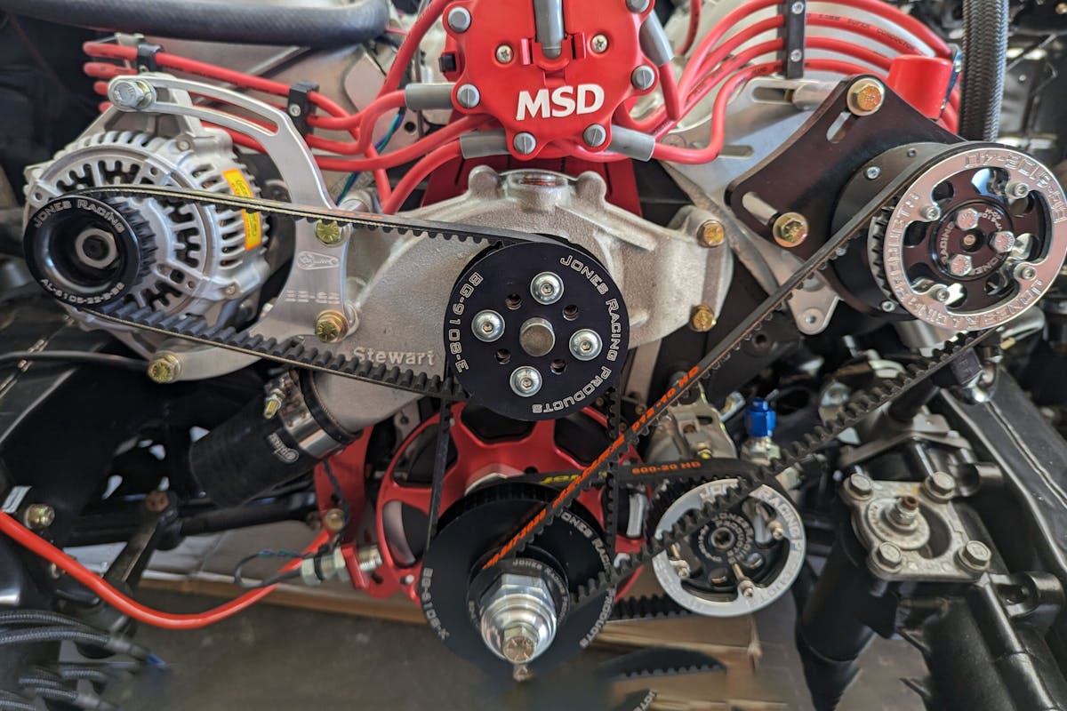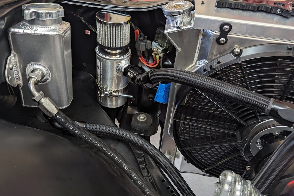 A big block needs a lot of cooling and crankcase ventilation, two things that Steve didn’t skimp over. A Ron Davis aluminum radiator cools this beast and black, braided hoses divert the fluids, fastened by trusty AN fittings at each end.