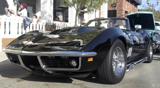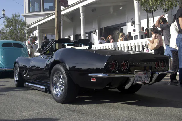 On the exterior of the car the complimentary combination of black and chrome continues. A set of chrome Hooker Side Pipes gracefully emerge from each side of car and provide a throaty exhaust note. Near the end of cruise session, Smith fired up the Corvette allowing bystanders to listen to harmonious sound of a healthy 350 with an enjoyable exhaust rumble. Shortly after letting the ‘Vette warm up, Smith hopped in and took the car out for a couple laps up and down Front Street in Old Town Temecula. With the streets crammed with spectators, classics, hot rods and muscle cars, it was the perfect venue for Smith to showcase the ’69 Stingray.