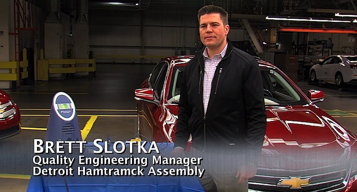 We are introduced to Brett Slotka, the manager of quality engineering at the Detroit Hamtramck Assembly–the plant responsible for building Impalas, Volts, and Malibus. He shows a variety of tools used to prepare the cars, including ostrich feathers and some simple gauges.
