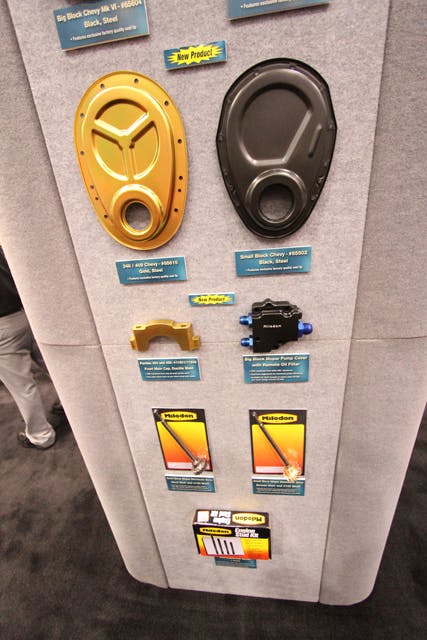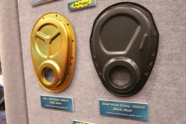 When we walked into Milodon’s booth at SEMA 2011 we were treated to a literal wall of new products. First of which were the new steel timing covers available for small and big block Chevys. “Finally a timing cover that will not let the seal pop out,” Said Milodon’s Steve Morrison. “The Milodon cover uses heavy gauge steel, a factory quality seal recess and is available in chrome, black or gold.”