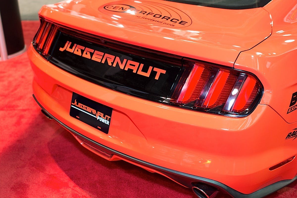 The 900 horsepower ’15 Mustang GT on display at M/T’s SEMA booth is equipped with a TVG Drag Pack built by Juggernaut Power. The car feature’s M/T’s ET Street R tires in the rear — so naturally, we began by asking Sneddon about the rear tires. Sneddon replied, “The ET Street R is a brand new tire thetas currently available. Although this tire resembles a drag slick more than a radial tire, it is D.O.T. legal. It was designed to drive to the strip, kill it at the track, then drive home safely. It’s not an every day street tire, so we only recommend it for occasional use. The same technology used in the ET Street Radial Pro tire, which is equipped on Outlaw-Pro cars that run a 3-second 1/8th-mile, goes into the ET Street R.”