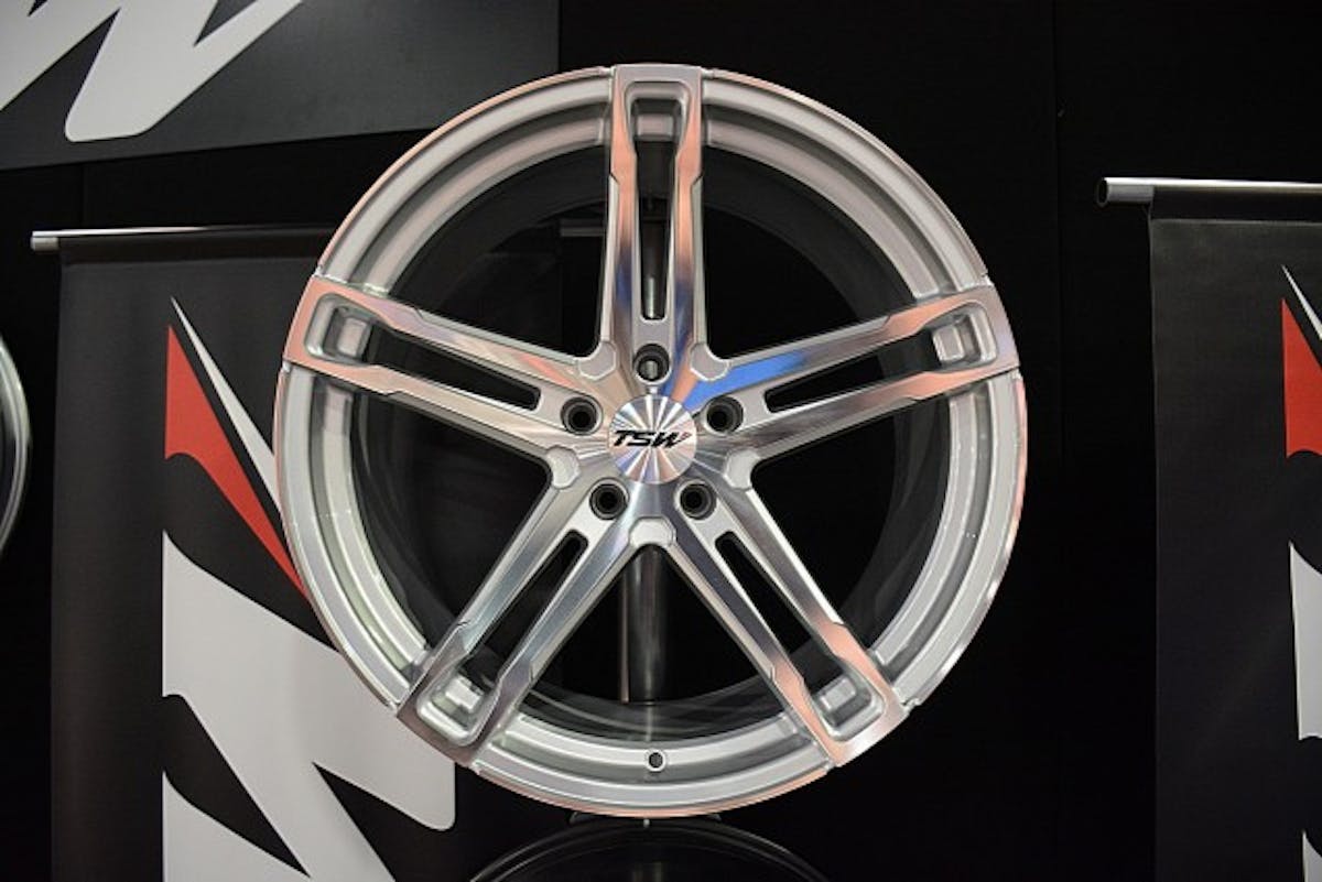 TSW’s agile Mechanica is a rotary forged wheel aimed at the luxury performance segment populated by Mercedes Benz, BMW, Lexus, and Audi. Sales rep Augy Nieves explained TSW’s manufacturing process for the Mechanica. “For rotary forging we low-pressure cast the face and spin out the barrel. The face is only about four or five inches deep and spin forging the breast of the barrel results in a lightweight wheel because the barrel is thinner, but the process makes for a more rigid, stronger wheel. This wheel is offered in two finishes, machined and silver and gunmetal with a black matte face. The face of the Mechanica has a concave angle to it which adds to the aggressive nature of the wheel.”