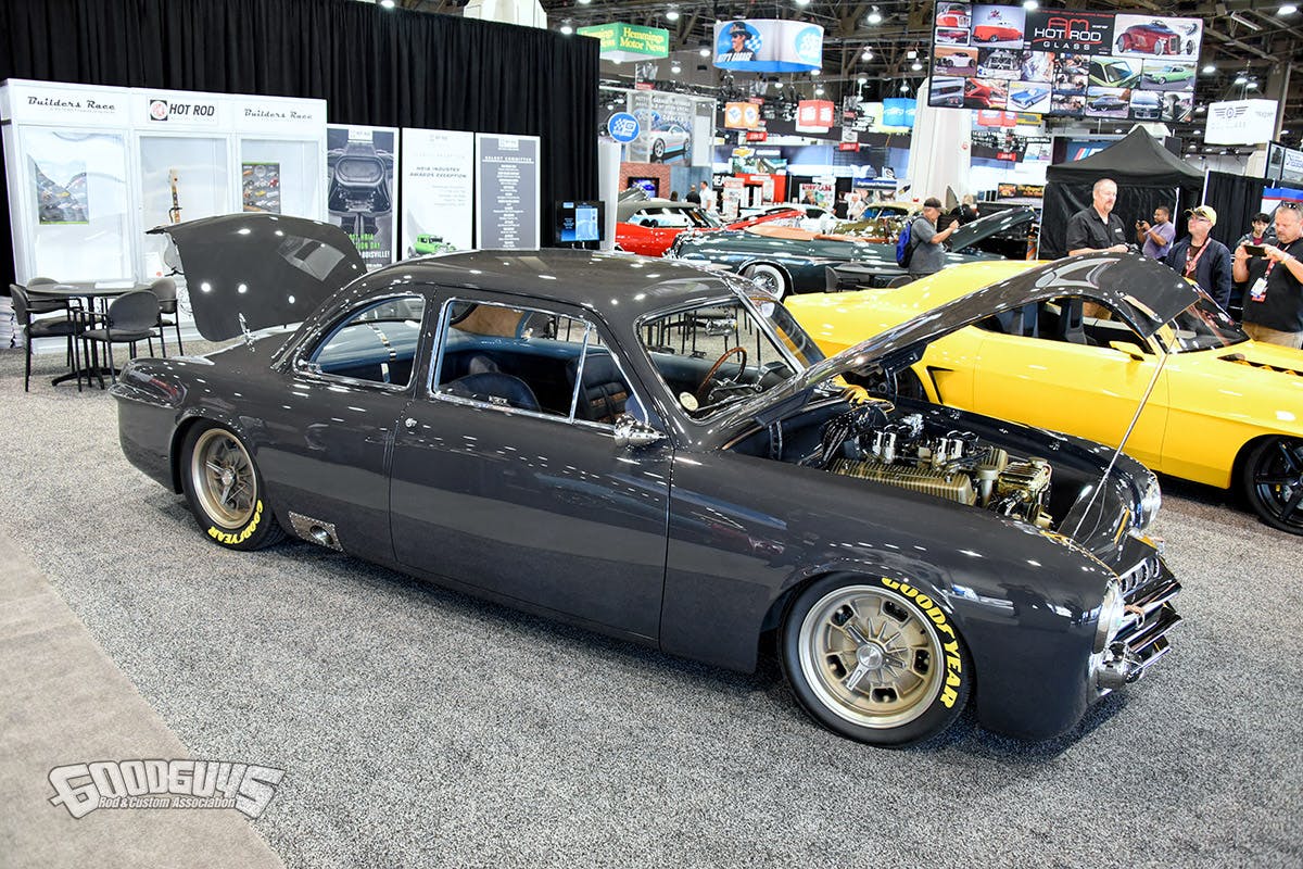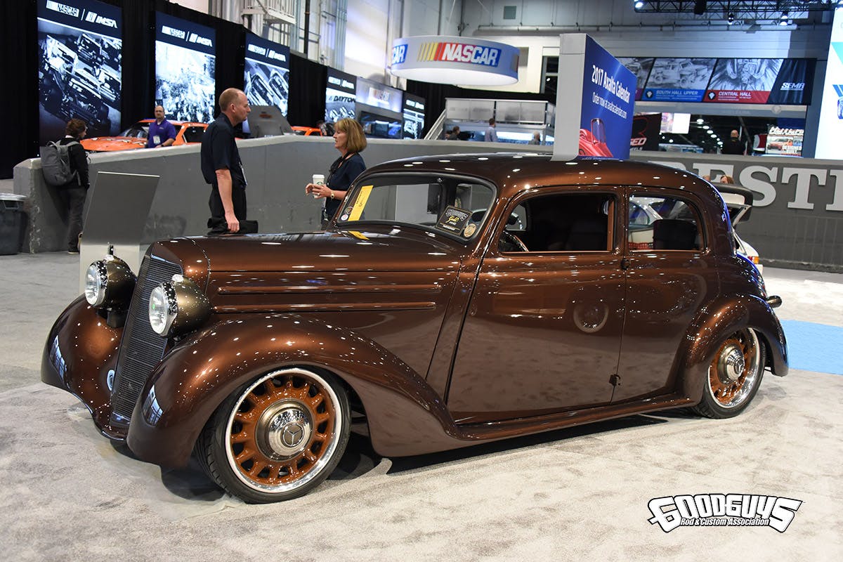 It’s not often that a European-inspired hot rod makes such a splash, but Mark Gooden’s 1952 Mercedes was the talk of the hall. Built at Samson Design in Marshall, Missouri, the roof has been chopped and wedge-cut, a pair of hand-made fenders join the running boards, and a custom frame supports the whole shebang with the aid of a modified Heidt’s suspension with QA1 coilovers.