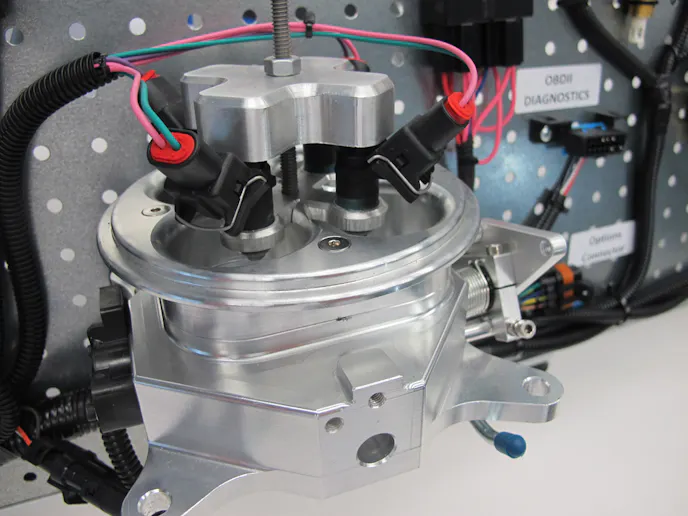 This is also the only, truly progressive four-barrel throttle-body fuel injection system on the market. It runs on a set of primaries just like a regular four-barrel carburetor, and you start bringing it into the secondaries and the rear injectors start phasing in until they are at full flow.