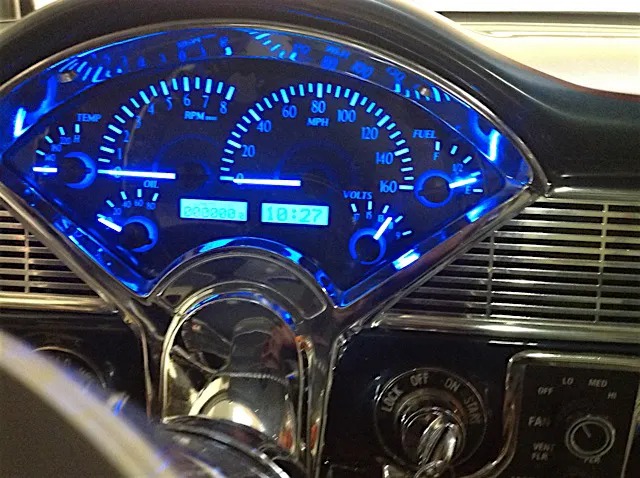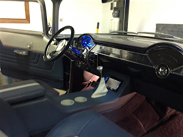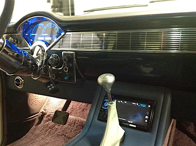 The Dakota Digital VHS dash has blue lighting to match the color cues of the car. “Everything is kept in check with an American Autowire complete system for ’56 Chevys,” Gary said. “I had the dash extended downward for the Southern Air climate control system that was put in.”