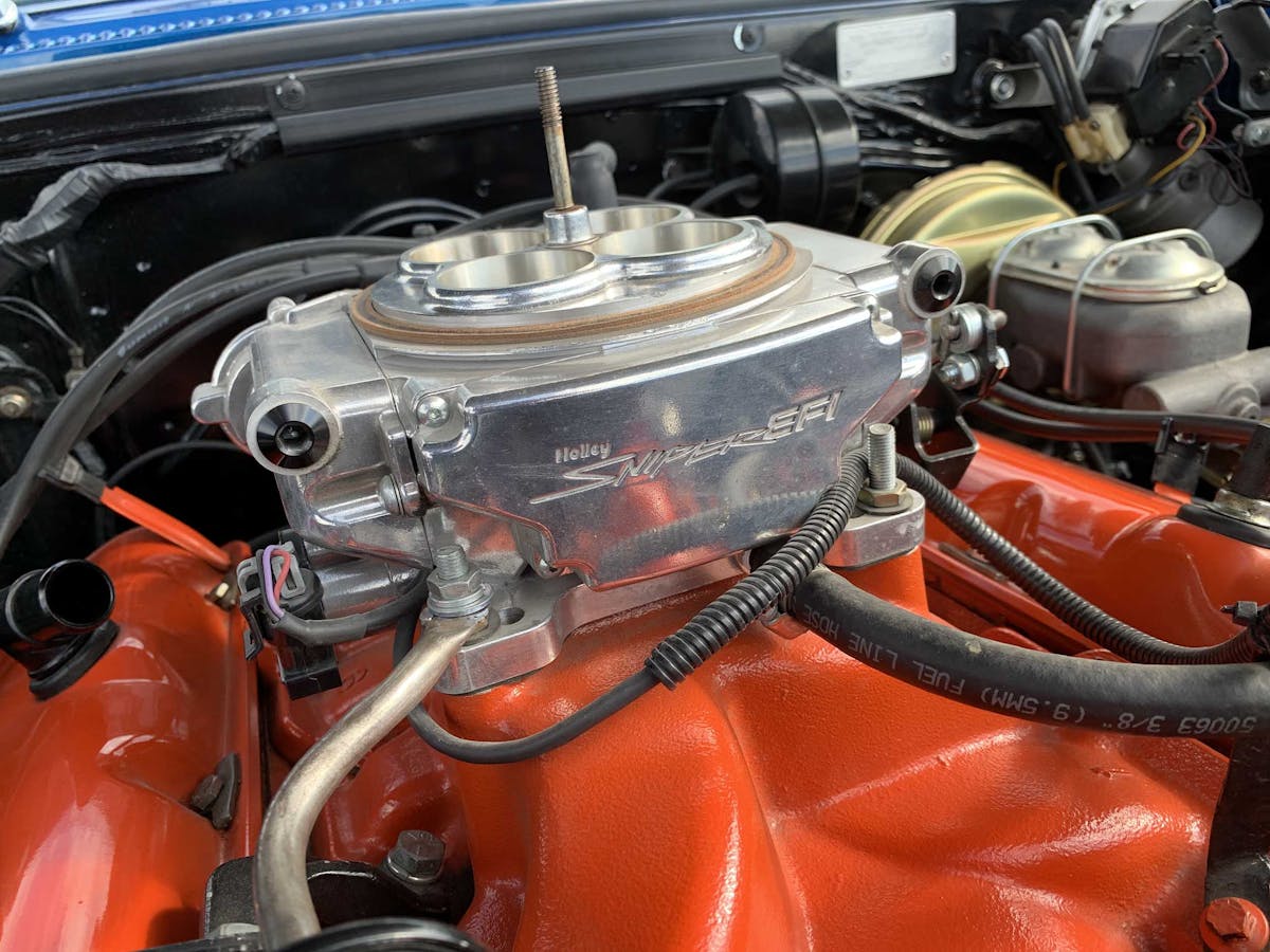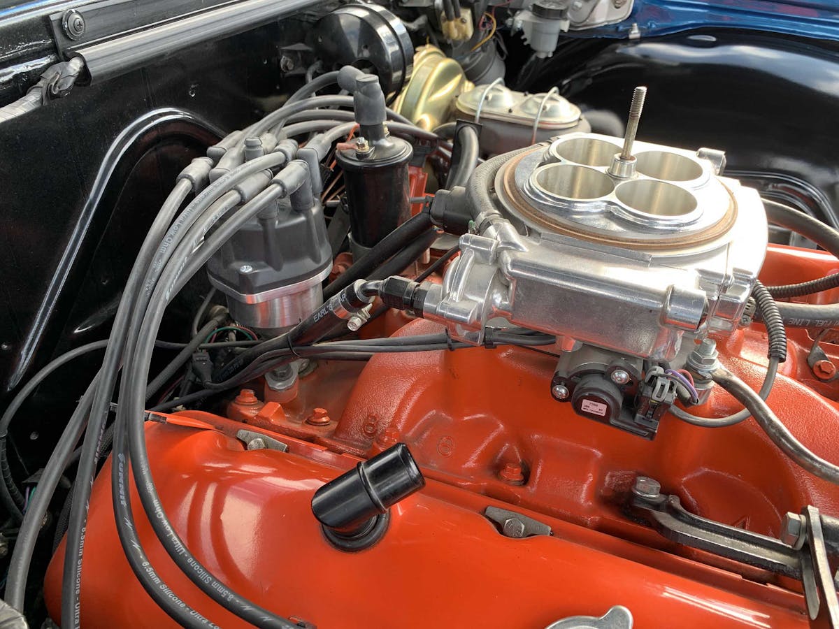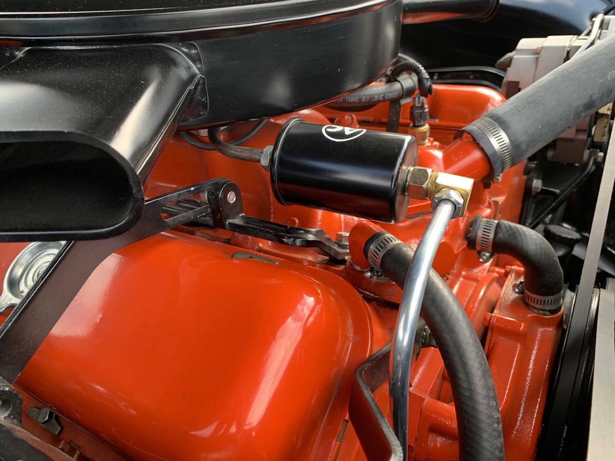 Bob went to great lengths to disguise anything that would give away the engine’s secret. Under that oh-so-OEM air cleaner assembly resides a Holley Sniper EFI unit and Hyperspark distributor, to which Bob ran all the hoses and wires down the rear of the engine by the firewall to keep them hidden. To further disguise the modern powerhouse, he fabbed up a faux fuel line and filter at the front of the air cleaner assembly. The ploy works well to deflect your psyche into thinking this is just a nice restoration.