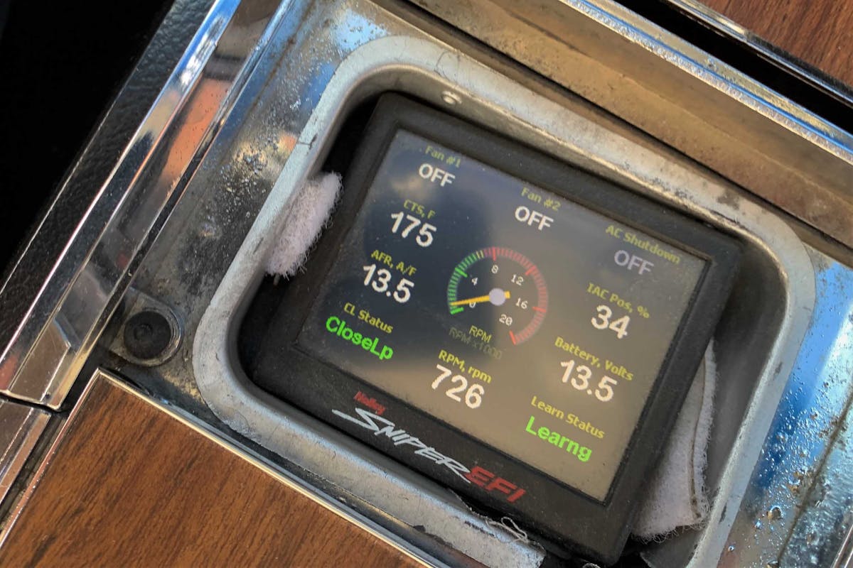 The console holds other surprises, as well. Since there’s a fat chance Bob would let anyone smoke inside his Chevy, he decided to better utilize the ashtray space by putting the Holley Sniper control panel into the unused space. When he wants to view it or make a change to the tune, he just slides the door forward, and voila. No more wielding screwdrivers out under the hood for Bob and his Caprice!
