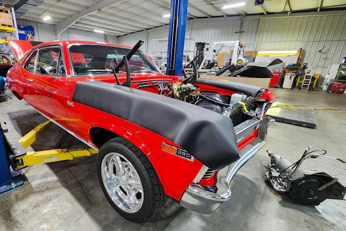 While the talented team at Prestige worked their magic under the rear of the Nova, Mike also commissioned them to upgrade the car’s driveline for even more power and drivability. To that end, a stroker 383 cubic-inch small-block was assembled and a 4L60e overdrive transmission replaced the aging three-speed auto.