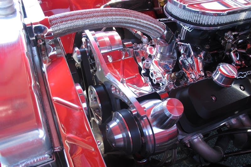 It’s no secret that a ’56 Chevy suspension is not the most technologically advanced way to accomplish a great ride. So, next on the list of “improvements” were a few suspension items. Robert started by adding a set of Classic Performance Products drop spindles and coil springs to the front and Hotchkis Sport Suspension leaf springs to the rear. A compliment of Viking adjustable shocks mounted on all four corners gives the car a great ride. Like all vehicles, the need to stop is bound to be a requirement at some point. To make sure that happens on a dime, Wilwood binders are part of the program.