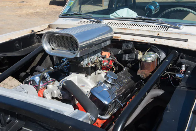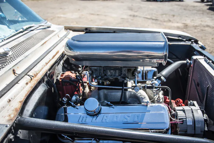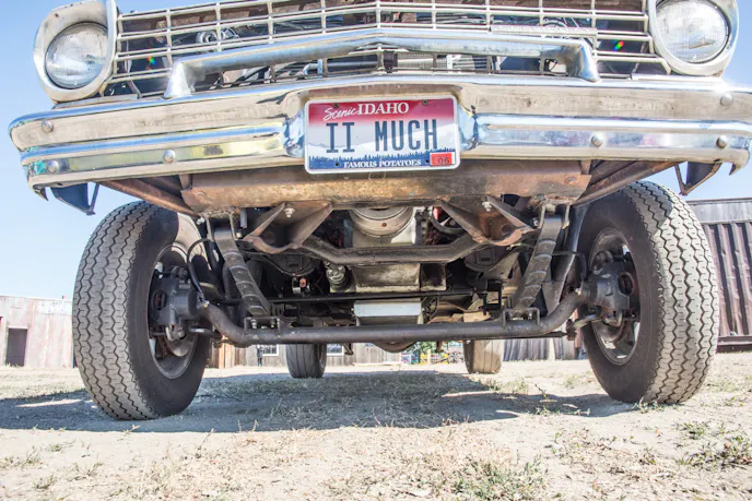 The engine is also fitted with an Edelbrock intake matched to a 950 cfm Holley carburetor, and the Hooker fenderwell headers let it exhale cleanly. It also has a turbo-400 automatic transmission and heavily upgraded rearend with a Strange spool, Strange 33-spline hardened axles, coilover rear shocks, and ladder bars.