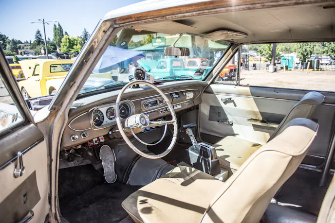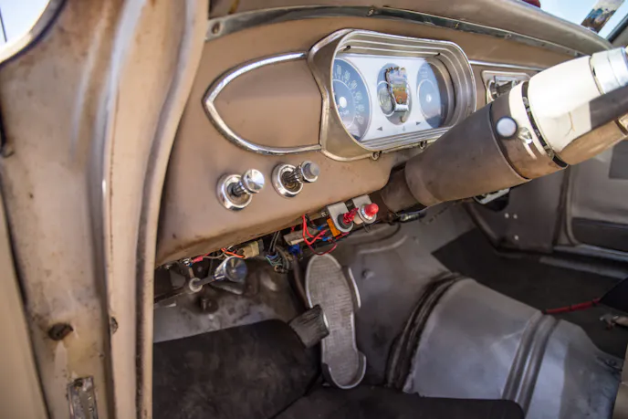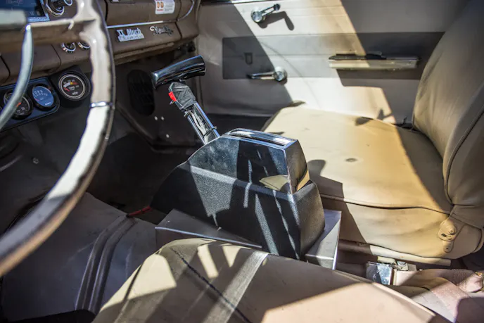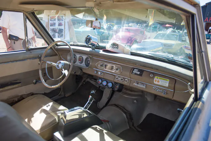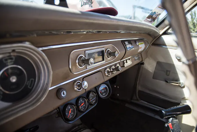 The dash makes use of the factory gauges, but Kenney has added a few more below the dash, so he can actually keep an eye on levels, rather than just having idiot lights for things like temperature, oil pressure, and voltage. On top of the dash, he added a tachometer as well.