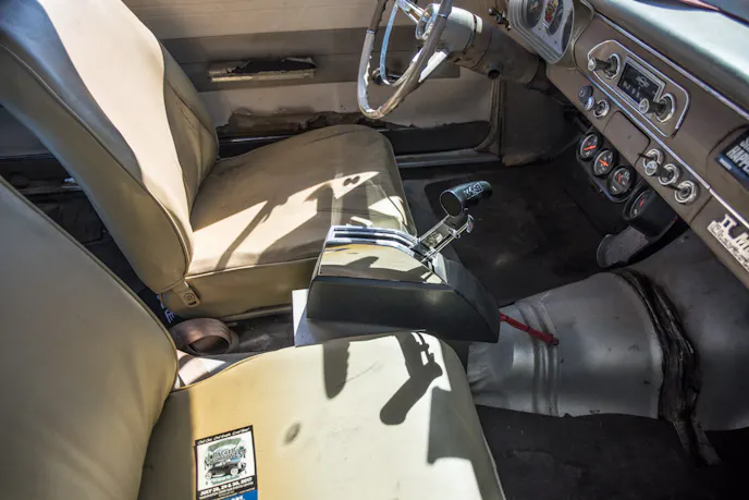 While Kenney left the original paint and patina on the exterior of the car, he did make a few changes to the interior – for comfort, safety, and convenience. He took out the old seats and replaced the front bench with bucket seats out of a late ‘70s Chevy Luv truck. The rear seat was… what rear seat? It’s a gasser, not a passenger car, there is no rear seat anymore.
