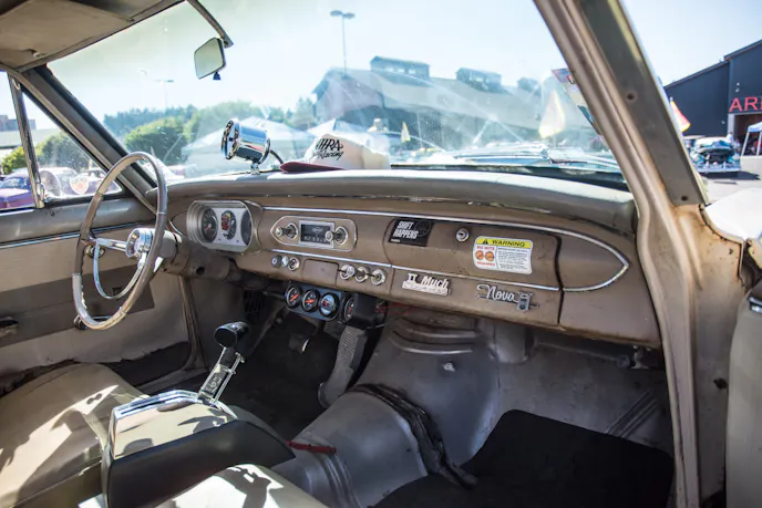 While Kenney left the original paint and patina on the exterior of the car, he did make a few changes to the interior – for comfort, safety, and convenience. He took out the old seats and replaced the front bench with bucket seats out of a late ‘70s Chevy Luv truck. The rear seat was… what rear seat? It’s a gasser, not a passenger car, there is no rear seat anymore.