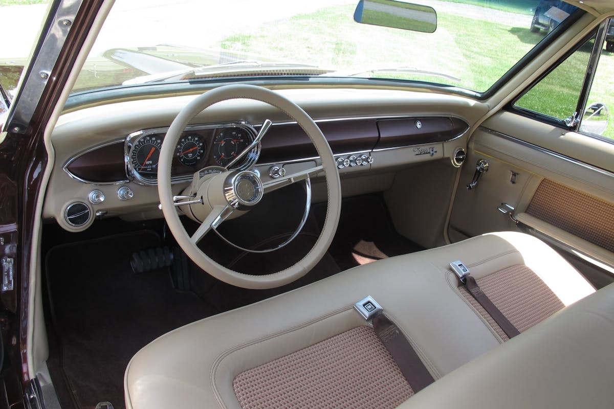 One glance inside, and it’s apparent the interior is a work of art. John Miller of Hide Originals in New London, Ohio, gets all the credit. “The original bench seat was heavily modified, and the seats were covered in an Almond-colored leather with a Deco Bronze woven leather inserts,” Paul says. Tunes are blasted from a hidden Sony radio through Kicker speakers.