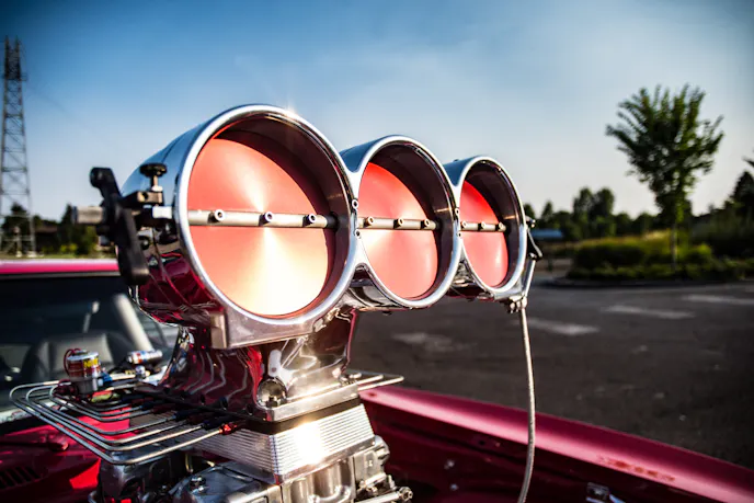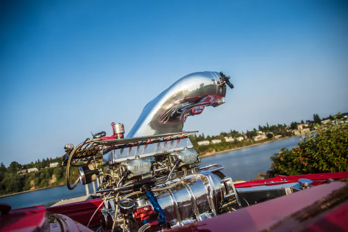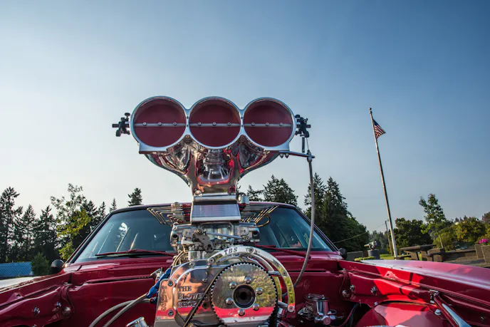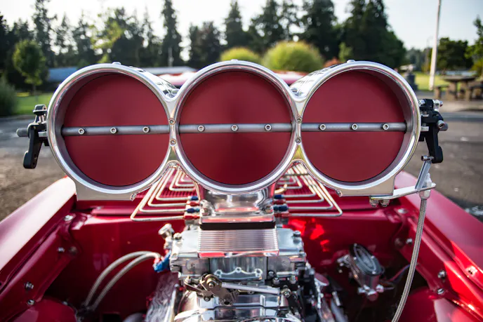 The engine is topped with a unique scoop that really helps to define the look of the car. Rick found it on eBay, and knew it was something different, so he snapped it up as fast as he could. It was designed for EFI rather than carburetors, so he had to get an adapter for it to fit his setup. But it was totally worth it. The car came with a decent intake, but this one is way cooler.