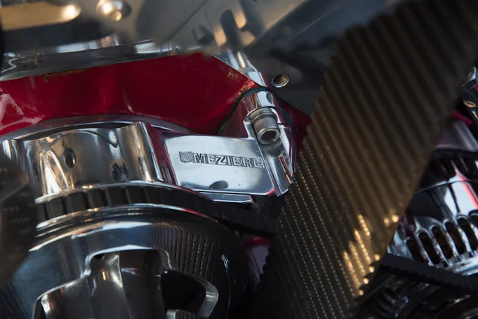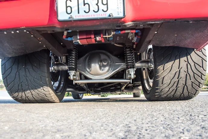 The car came with stock upper and lower control arms and springs that had been cut to lower the front end. “It was slammed to the ground,” Rick said. “But that wasn’t part of the original restoration.” He didn’t like how it rode when it was setup that way, so he swapped the stock stuff for Heidts front control arms and QA1 adjustable coilovers. It also has Wilwood disc brakes all the way around, a Ron Davis radiator, and an electric water pump.