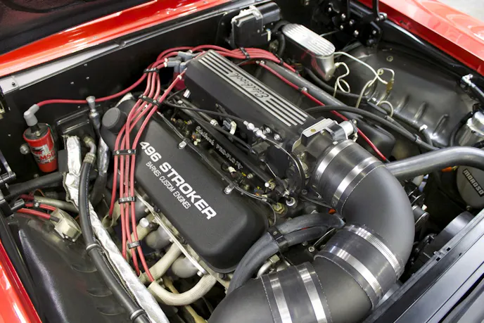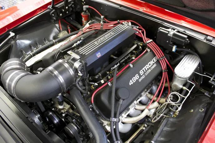 Under the hood is where things really get interesting. The engine is one of the last creations of Jim Barnes of Barnes Racing Engines in Bakersfield, California. The 496 cubic-inch engine, was born from a 454 cubic-inch big-block and powers this red head, passing an insane amount of torque through the TCI-prepared Turbo 400 Street Fighter transmission. The shift points are deftly handled by a set of steering-wheel-mounted paddle shifters by Master Shift, putting shift changes literally at your fingertips. With a torque converter displacing a stall speed of 2,000 rpm, the Camaro can be easily driven on the street, all the way to the local dragstrip — the legendary Famoso Raceway.