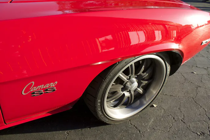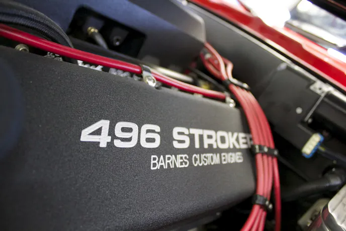 Under the hood is where things really get interesting. The engine is one of the last creations of Jim Barnes of Barnes Racing Engines in Bakersfield, California. The 496 cubic-inch engine, was born from a 454 cubic-inch big-block and powers this red head, passing an insane amount of torque through the TCI-prepared Turbo 400 Street Fighter transmission. The shift points are deftly handled by a set of steering-wheel-mounted paddle shifters by Master Shift, putting shift changes literally at your fingertips. With a torque converter displacing a stall speed of 2,000 rpm, the Camaro can be easily driven on the street, all the way to the local dragstrip — the legendary Famoso Raceway.