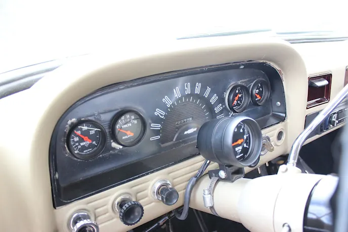 On the inside you won’t find anything fancy. A basic black bench seat with simple pleating fulfills the duty for comfort. There’s no air conditioning or heater in this ride either. Baldonado did add a small stereo, which is two speakers in boxes sitting on the transmission hump. “I put them there so I can pop them out if I park somewhere, so nobody will break into my truck,” explained Baldonado. There is some basic upgrades, such as a column mounted tach, and a set of Auto Meter gauges to keep an eye on the motor’s vitals.