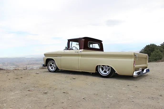 The truck itself is a 1960 Chevrolet C10 short bed fleet side, but there is a list of modifications that have been done to make it unique. To start, it appears to be in primer with a painted top. That’s not the case though as the beige color is actually Hot Rod Flatz Paint, California Suede Metallic.