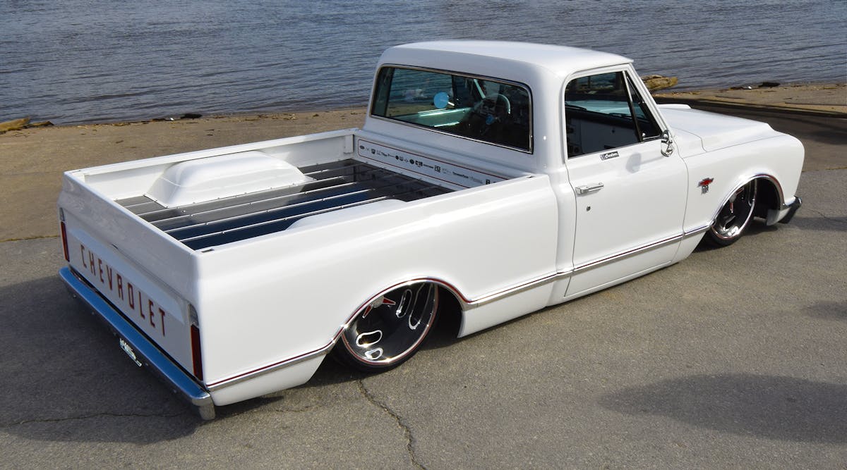 The project started with a 1967 C10 short bed pickup. The cab is from a 1972 model year because it is an air conditioning cab. It also has a big back window. The truck is all steel and features factory-tinted glass all around. While many builders opt to add one-piece side windows during their build, this truck retains the factory side window “wings.” “The original build kept the original look by keeping the bumpers, door handles, wing windows, mirrors, and tailgate,” Dennis says. “The bed floor does lift up for some storage, to allow us to get to the air ride, and to show off (laughs).”