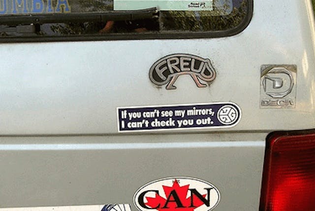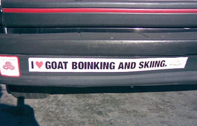 There’s plenty to distract you while driving, like the DVD players mounted in many of the soccer mom SUV vehicles. Even if they aren’t installed in your car, it’s fun to watch a movie that’s playing in the car directly in front of you on a busy highway. Southern California divers have their own version of the game Scrabble, and it’s played on license plates. Some of the plates are downright challenging to decipher. Despite these distractions, there’s no replacement for the tried and true bumper sticker.