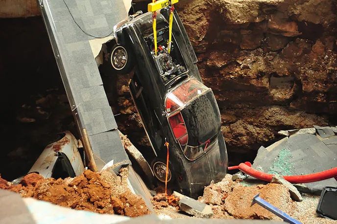 Just as the world was waking up and hearing about the sinkhole swallowing eight iconic Corvettes from their display area in the NCM’s Skydome, staff at the NCM had already spent hours evaluating the devastation. Each of the rare and classic Corvettes, with a total value of over $1 million, now resided some 30 feet below the floor of the NCM. The resting place of several Corvettes was still viewable from the surface while others’ fate was hidden by tons of rubble and Kentucky soil.
