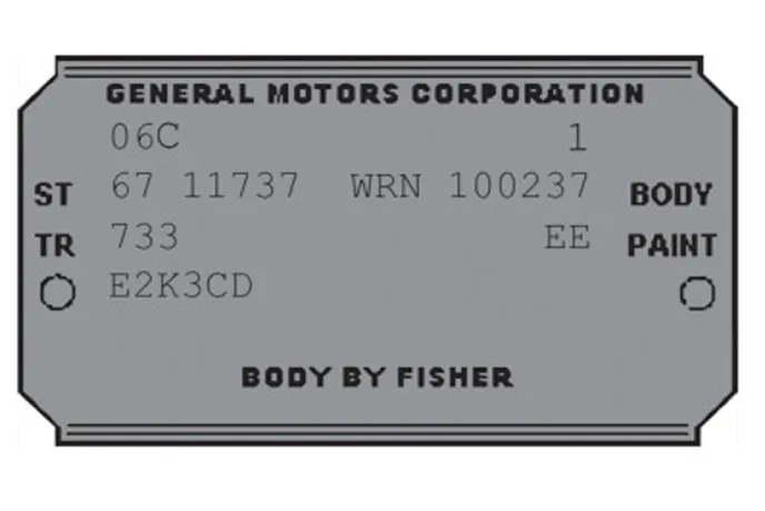 The second line, 67 11737 WRN 100237, is essentially confirming what the VIN already told us. The first two digits are the year, in this case, 1967. The second set of numbers matches the VIN, and tells us the same information, the WRN tells us it was built at the Willow Run, Michigan, plant, and the 100237 is the Fisher Body Sequence Number.