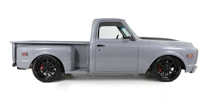 This C10 is a stunning sight, with its Dodge Smokehouse Grey paint, which has a pearl metallic flake that glimmers under the SoCal sun. The custom battleship-gray body color is contrasted by a custom dark graphic and a black accent on the hood, which are also reflected in the interior.