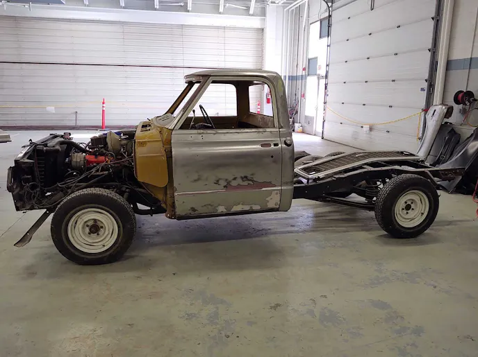 The complete list of modifications to the frame includes altering the wheelbase by 12 inches, notching the frame rails in the rear to allow for a lower stance, and installing a full array of QA1 suspension components once the frame is stripped and powder coated. An LS-swap is in store for the truck going forward and of course, the interior, wiring, driveline, bodywork, and brightwork will all be completed by the students as they hone their skills toward an education.