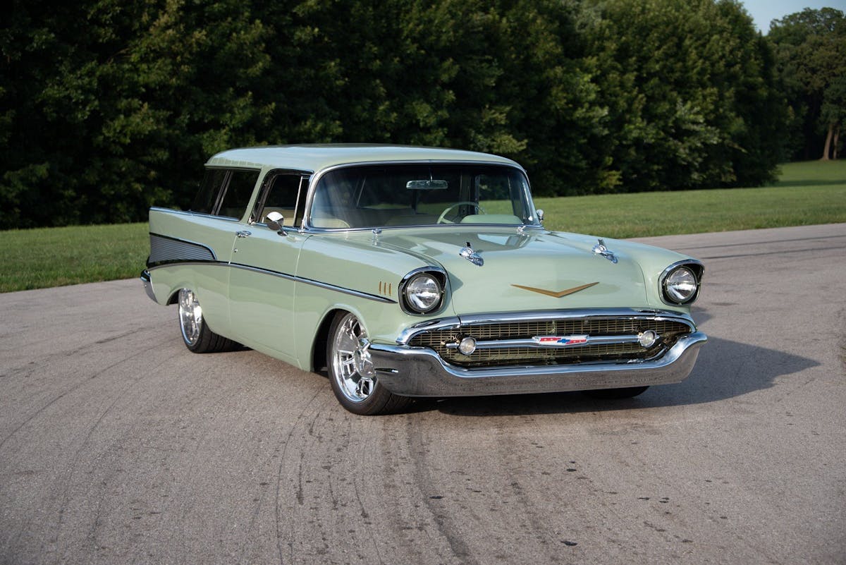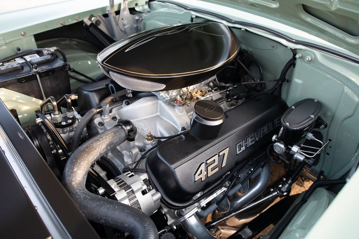 Under the hood of this unbelievably cool ’57 Chevy, we find a big block backed by a 700R4 going all the way back to a 3.73-geared 9-inch rearend. The foundation is a complete Art Morrison GT Sport chassis that has been powdercoated black and has coilovers and a four-link. Upfront is a power-assisted rack-and-pinion steering system. The Wilwood brakes are surrounded by Billet Specialties wheels measuring 18×8 and 20×10. The Nitto 245/40R18 and 275/35R20 are the rubber that meets the road.