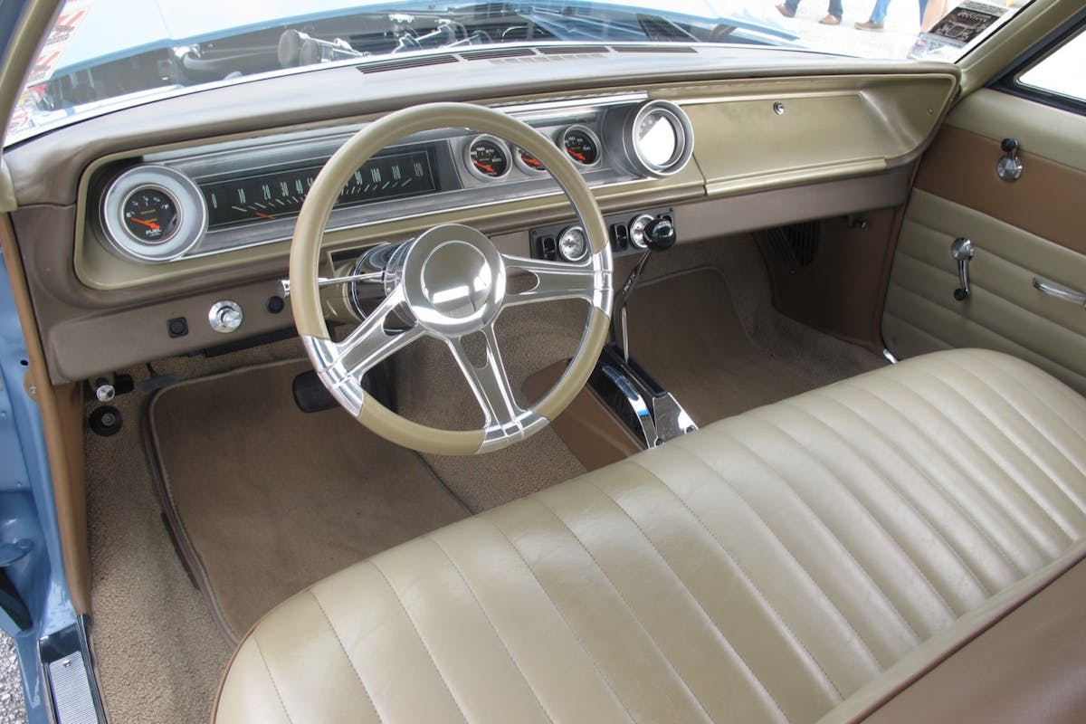 Inside this hot rod, one soon realizes a stock-ish vibe with an updated twist. The tan and brown vinyl seats and the addition of aftermarket gauges, chrome tilt steering column and billet steering wheel — not only add to the look of the car, but also help it actually stand out in a crowd.
