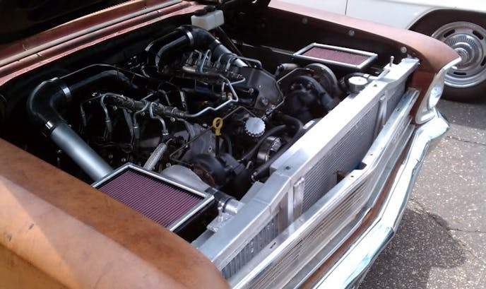 The Duramax diesel has been equipped with a pair of Buick Grand National Turbos pumping out 6lbs of boost. The factory Allison transmission was way to big and heavy to fit under the wagon, so Hughes replaced it with a 4L80E with a 2200RPM lockup converter.