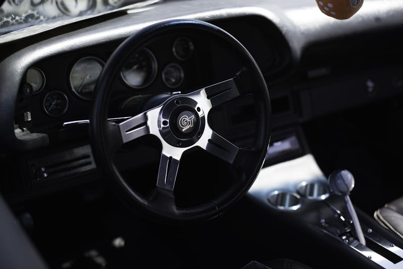 The interior is a custom design by Ron Wilson of Spanaway Upholstery. He did the front seat, back seat, and the custom-wrapped center console. The interior does a really nice job of rounding out the look of the build, as the soft, supple vinyl really compliment the black and silver exterior of the car.
