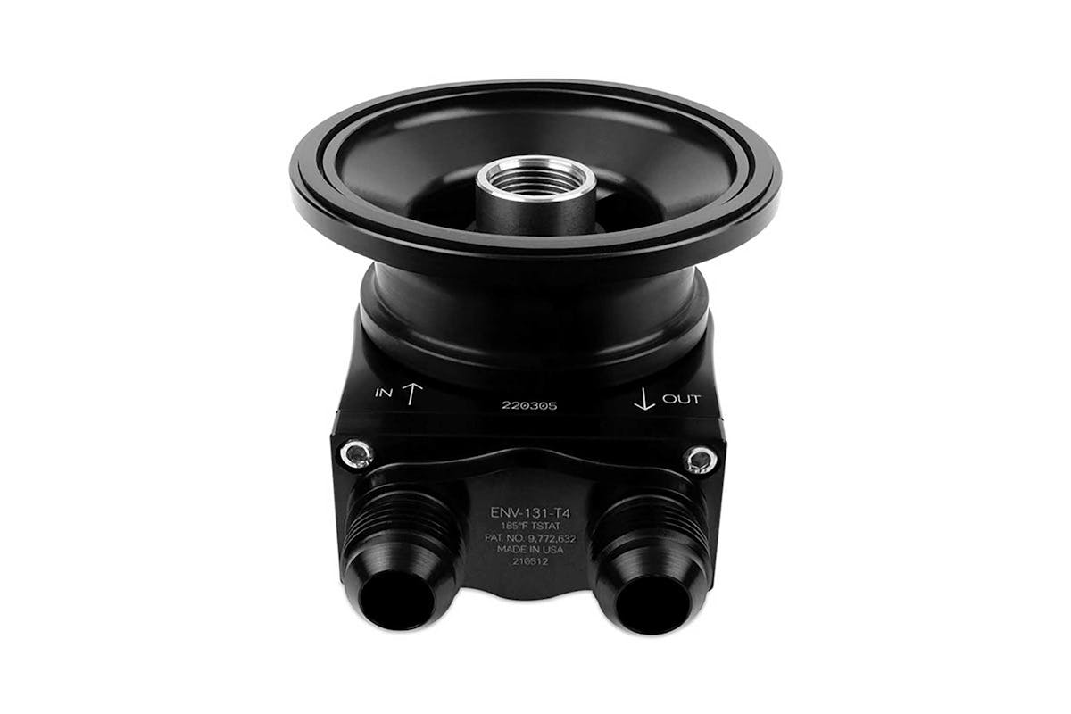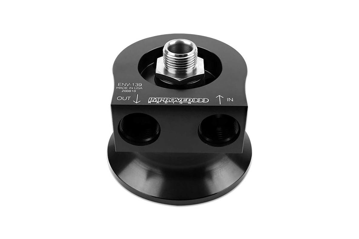 If space is an issue, Improved Racing also has a remote oil- and transmission-fluid filter mount. By mounting your engine’s oil filter remotely, you can gain additional cooling, as well as necessary space for any installation. Like the thermostatic cooler, Improved Racing’s remote filter mount also includes a thermostat to ensure the fluid gets to a safe operating temperature quickly before being diverted to the cooler. The inlet and outlet ports are in standard -10AN O-ring boss threads. Optional fittings are available to accommodate -6 AN, -8 AN, -10 AN, and -12 AN lines, or 3/8- and 1/2-inch hose. The remote filter adapter is compatible with M22x1.50, 13/16-16, and 3/4-16 filter threads (filter thread adapter screw sold separately) and are compatible with filters using gaskets up to 3.55-inch outer diameter.