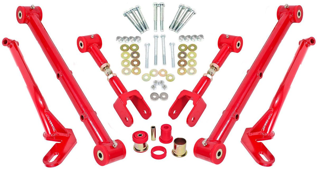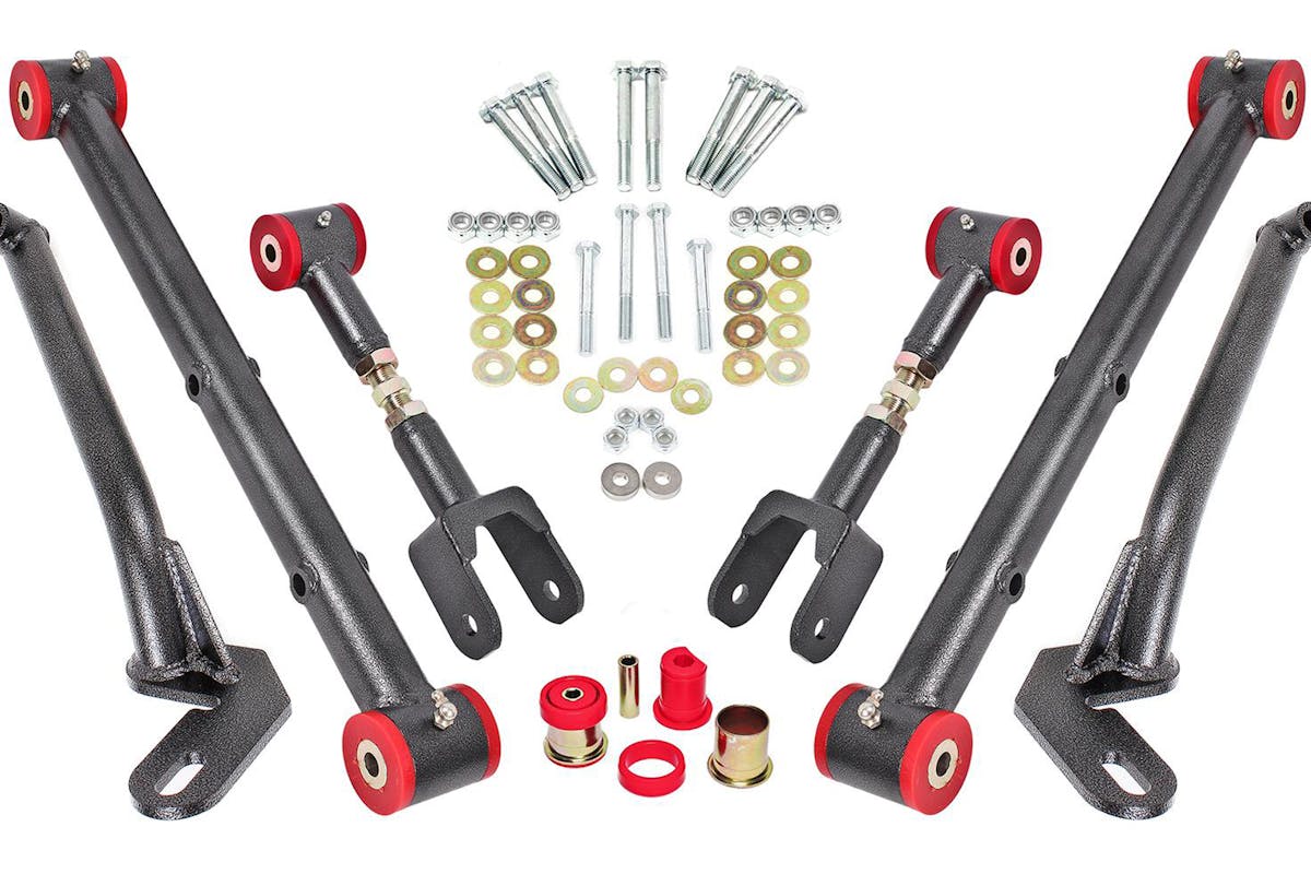 The kit consists of non-adjustable lower control arms, adjustable upper control arms, and control arm reinforcement braces. The kit is completed with polyurethane differential bushings and hardware for everything. The lower control arms are manufactured from heavy-duty 1.50-inch diameter, 0.120-inch wall, DOM steel tubing, the lower control arms provide all the strength you’ll need for any performance application. The upper control arms are manufactured from 1.25-inch diameter, 0.120-inch wall, DOM steel tubing, strong enough for any compression load.