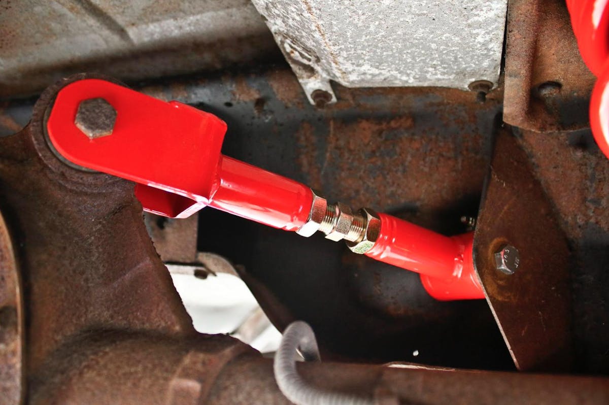 The upper control arm’s adjustability comes via the CNC-machined center adjuster made of chromoly steel. It also features rolled threads for the ultimate in strength and durability. This design gives you a strong control arm that greatly improves performance. The reinforcement braces are made from 1.0-inch diameter, 0.156-inch wall, steel tubing to help reduce frame deflection. The upper and lower control arms come with greasable, 95-durometer polyurethane bushings.
